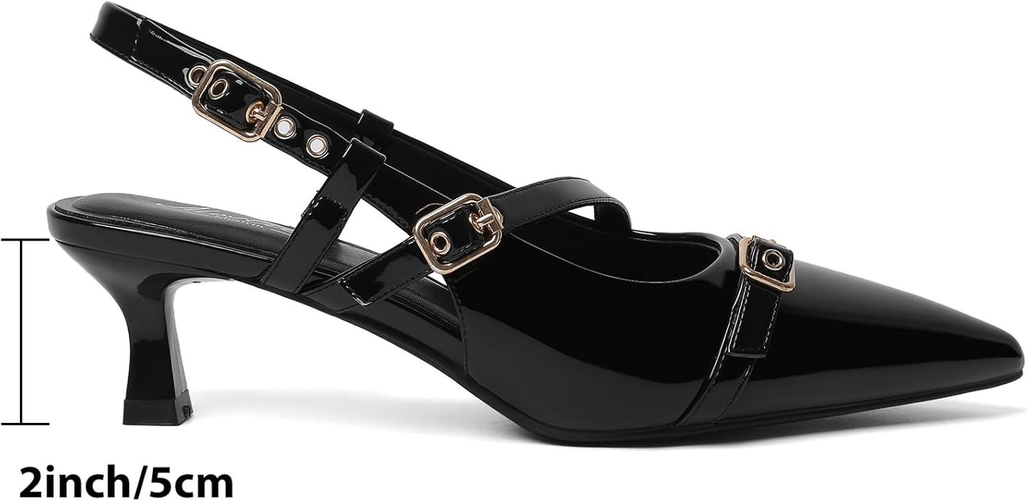 Mostrin Kitten Heels for Women Low Heel Closed Pointed Toe Slingback Pumps Buckle Strap Dress Shoes for Daily Working Wedding(Black #04)