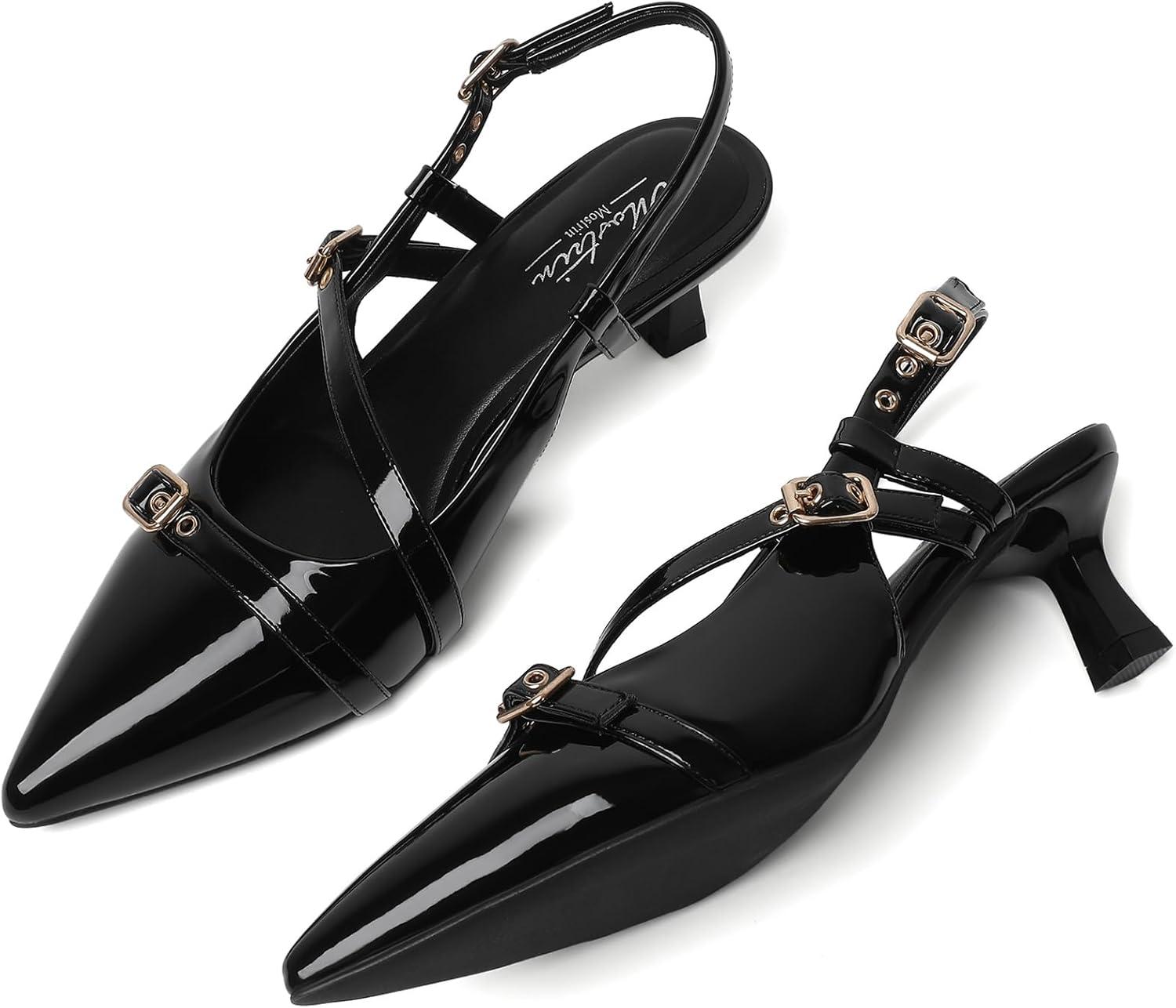 Mostrin Kitten Heels for Women Low Heel Closed Pointed Toe Slingback Pumps Buckle Strap Dress Shoes for Daily Working Wedding(Black #02)