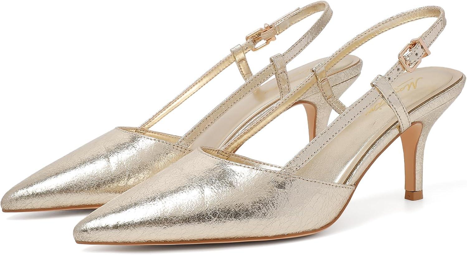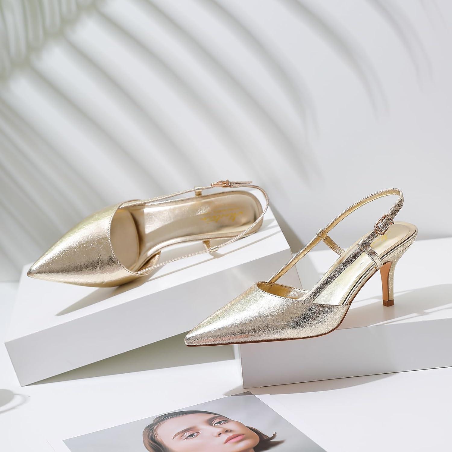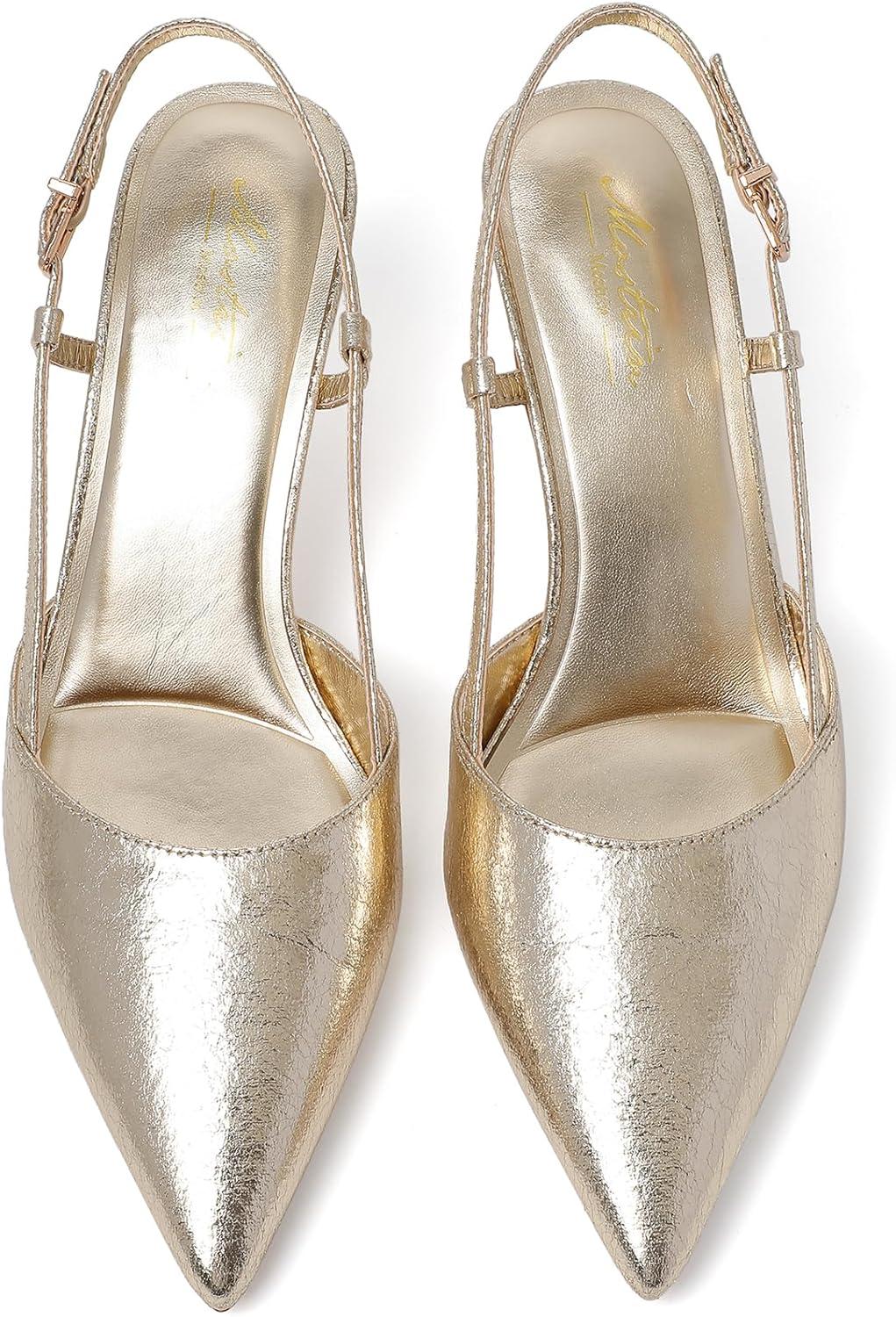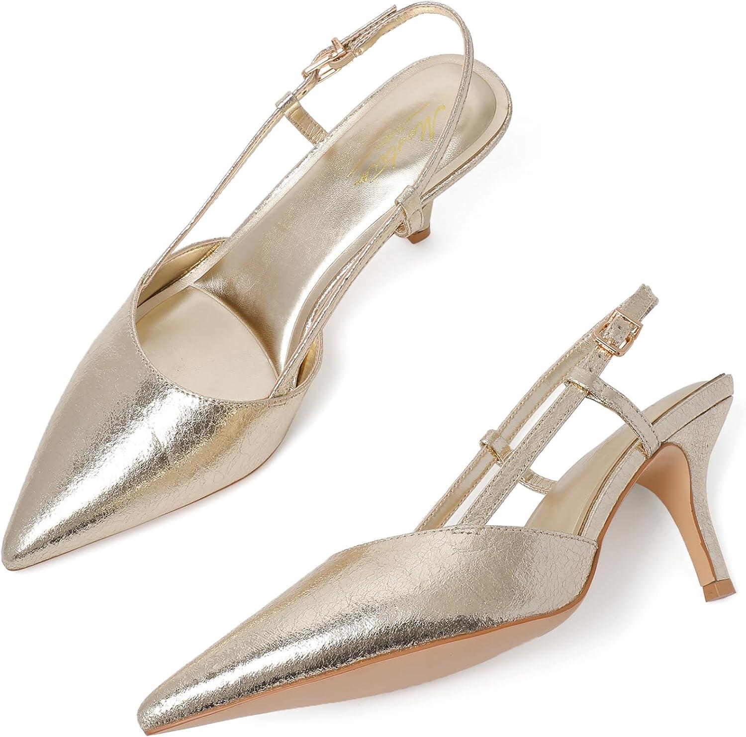 Mostrin Kitten Heels for Women Pointed Closed Toe Stilettos Slingback Low Heel Bow Pumps Dress Shoes for Daily Party Wedding(Gold#01)