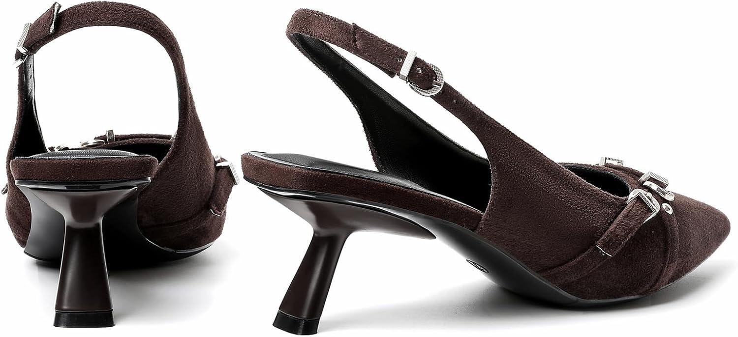 Mostrin Kitten Heels for Women Pointed Toe Pumps Patent Leather Low Heel Slingback Heels with Buckle Dress Shoes for Dating Party Working(Darkbrown Suede 03)