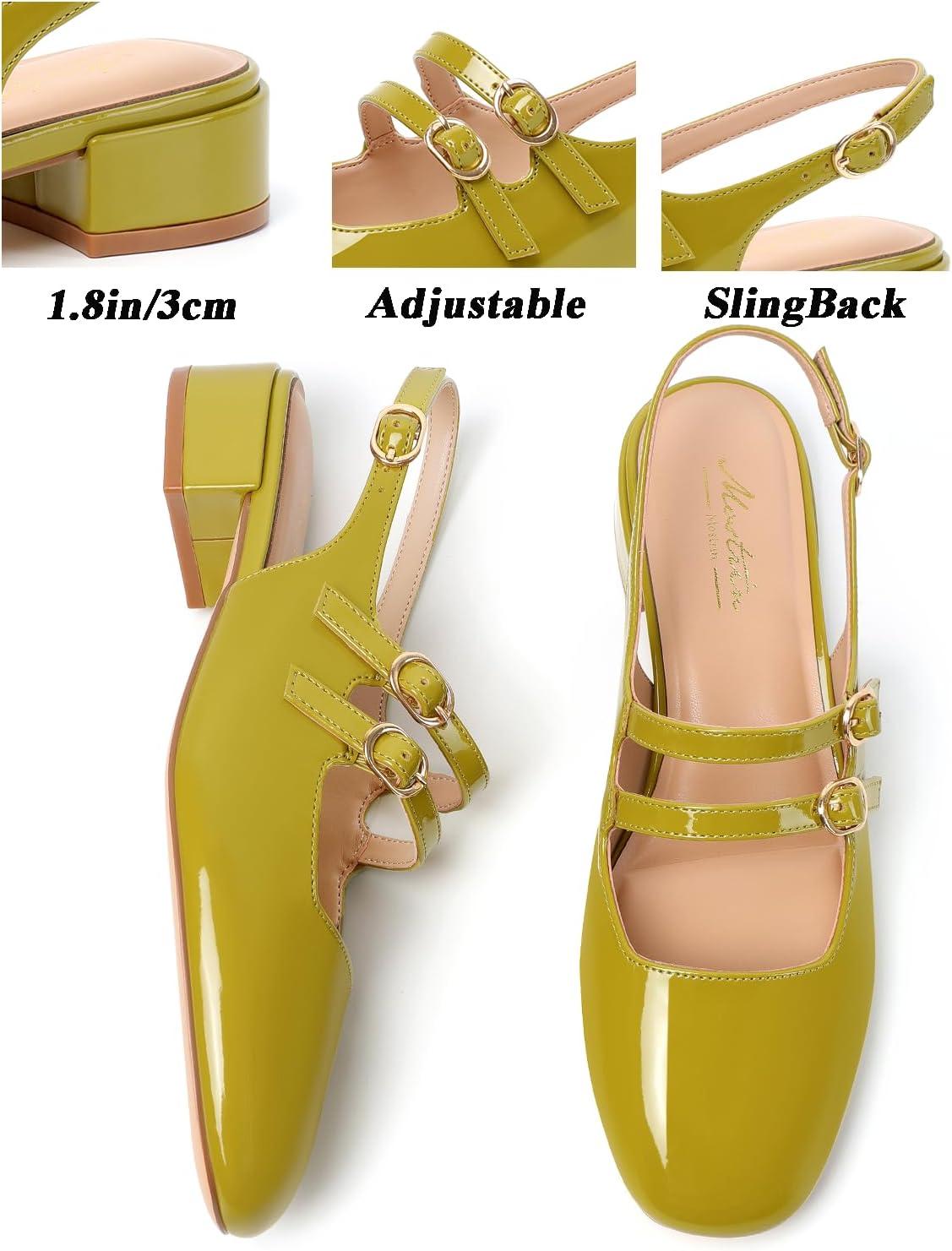Mostrin Mary Jane Shoes Women Slingback Chunky Low Heels for Women Closed Rounded Toe Ankle Strap Pumps Daily Wedding Party Dress Shoes(Green)