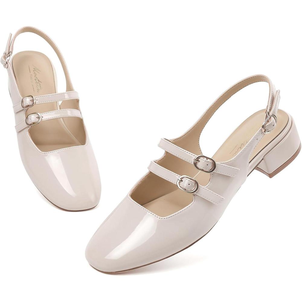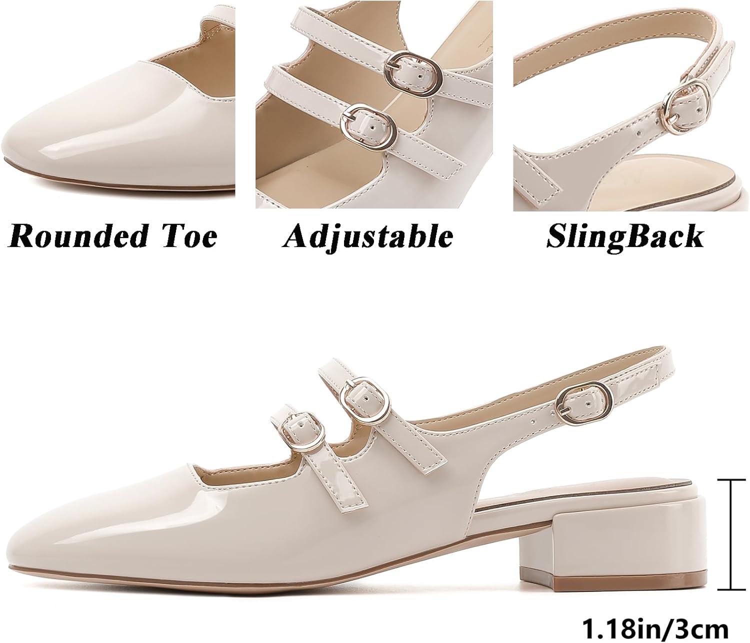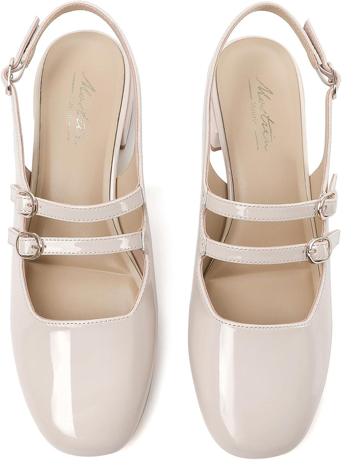 Mostrin Mary Jane Shoes Women Slingback Chunky Low Heels for Women Closed Rounded Toe Ankle Strap Pumps Daily Wedding Party Dress Shoes(Nude)