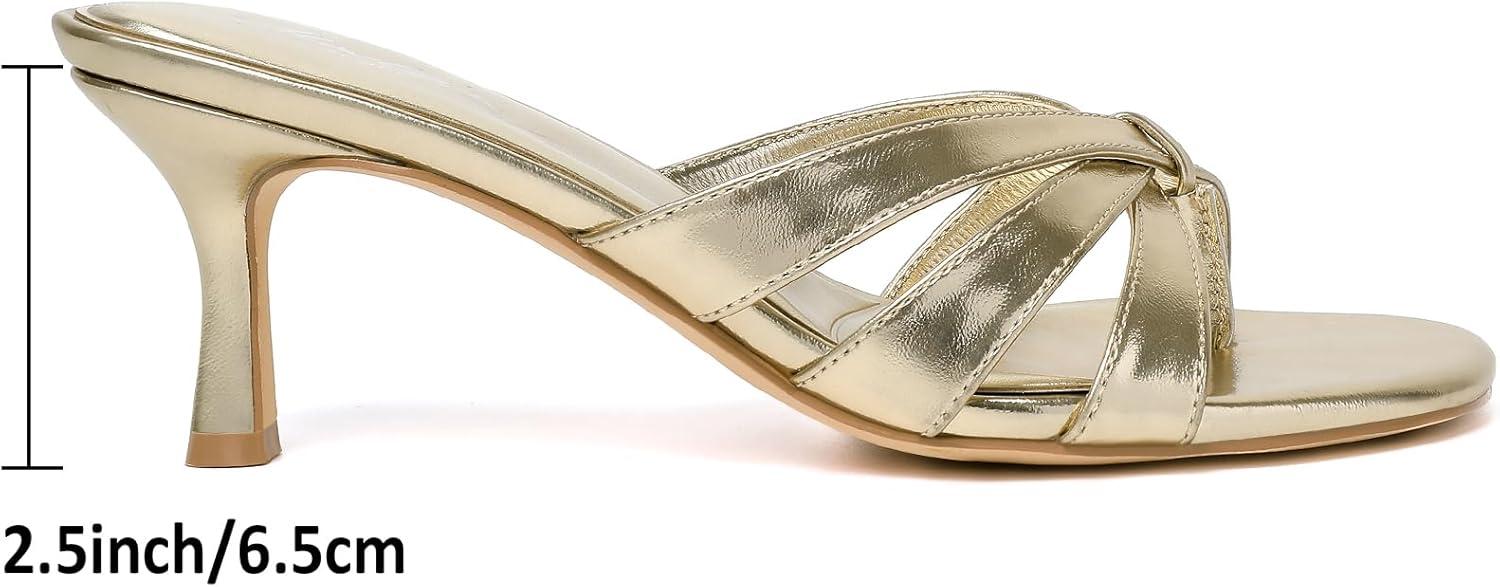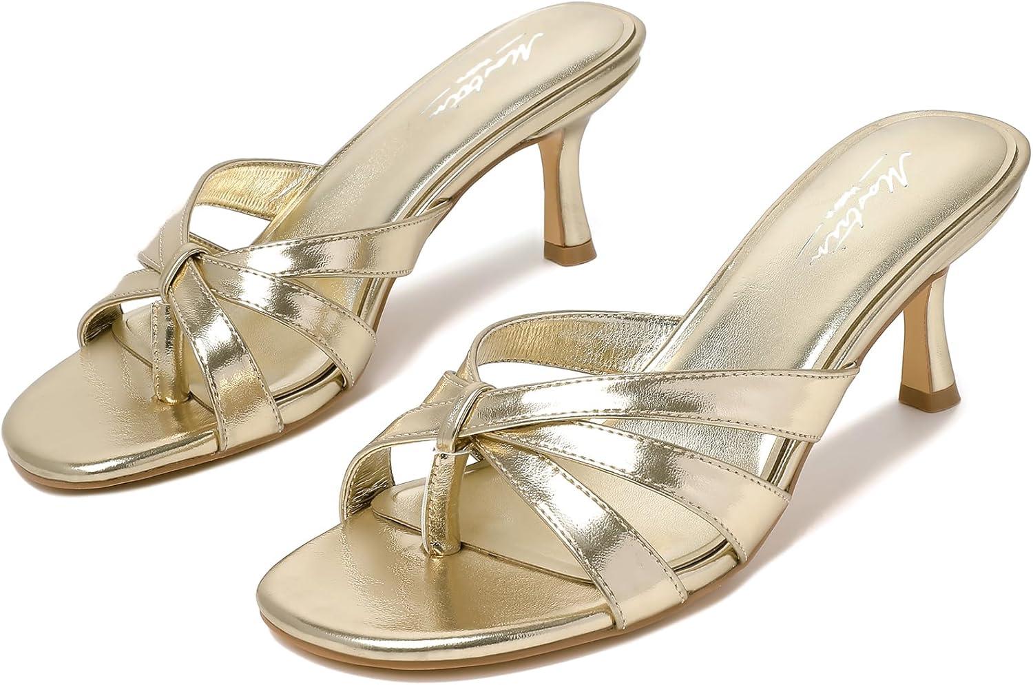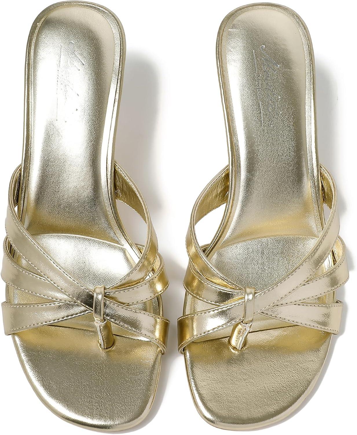 imageMostrin Strappy Kitten Heels for Women Round Open Toe Flip Flops Slip On Mules Heels Fashion Thong Heeled Sandals for Party Wedding HolidayGold