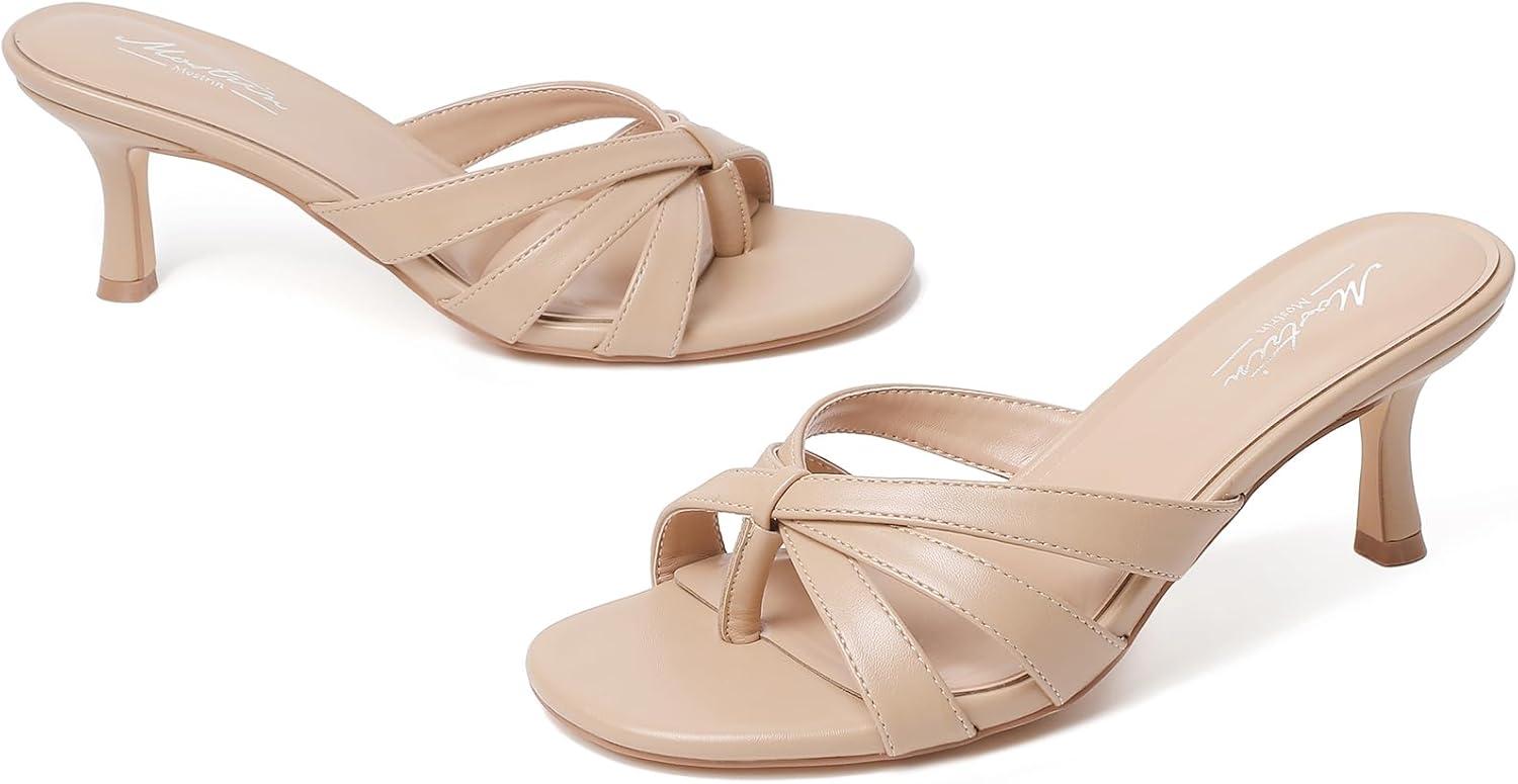 imageMostrin Strappy Kitten Heels for Women Round Open Toe Flip Flops Slip On Mules Heels Fashion Thong Heeled Sandals for Party Wedding HolidayNude