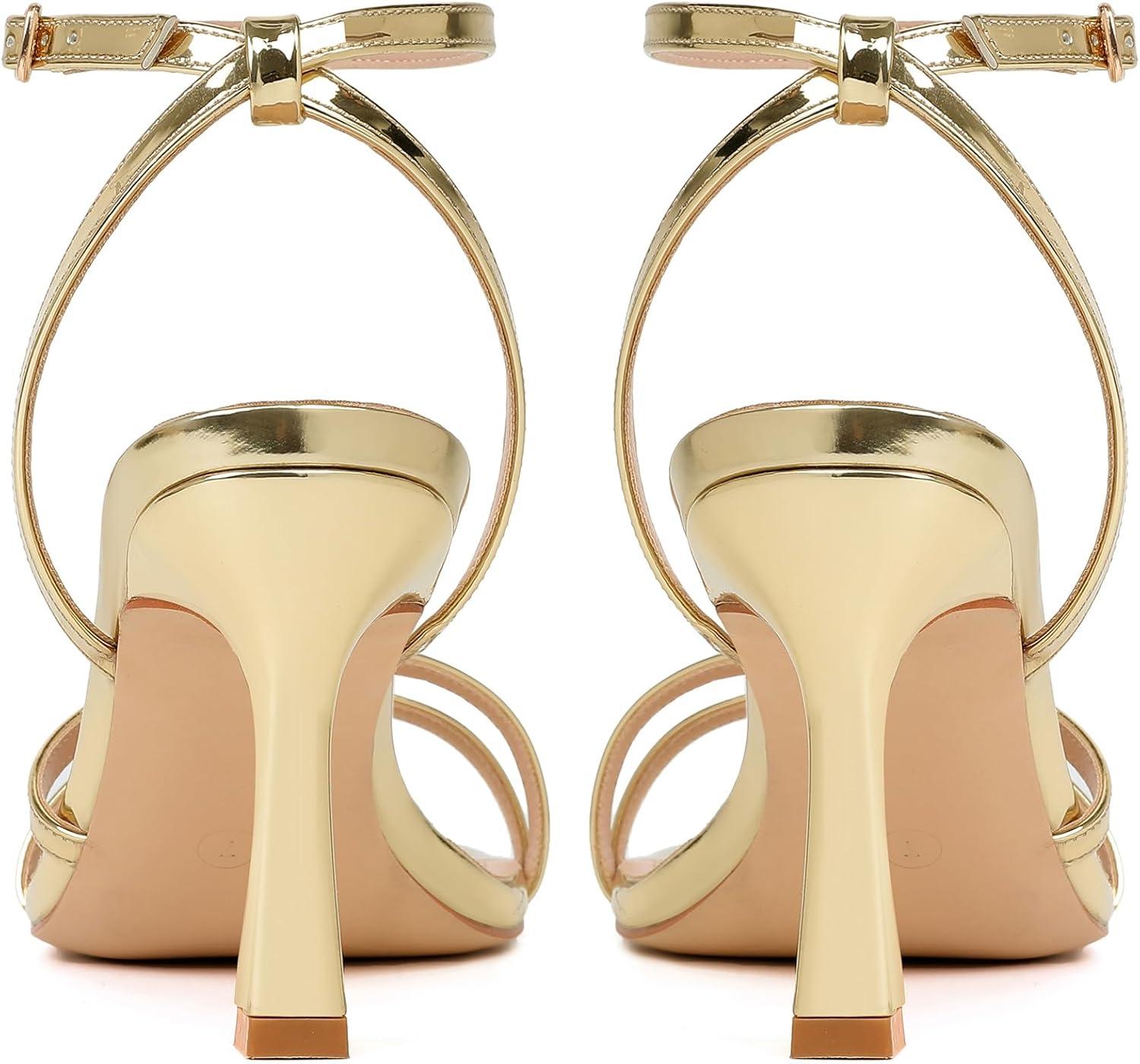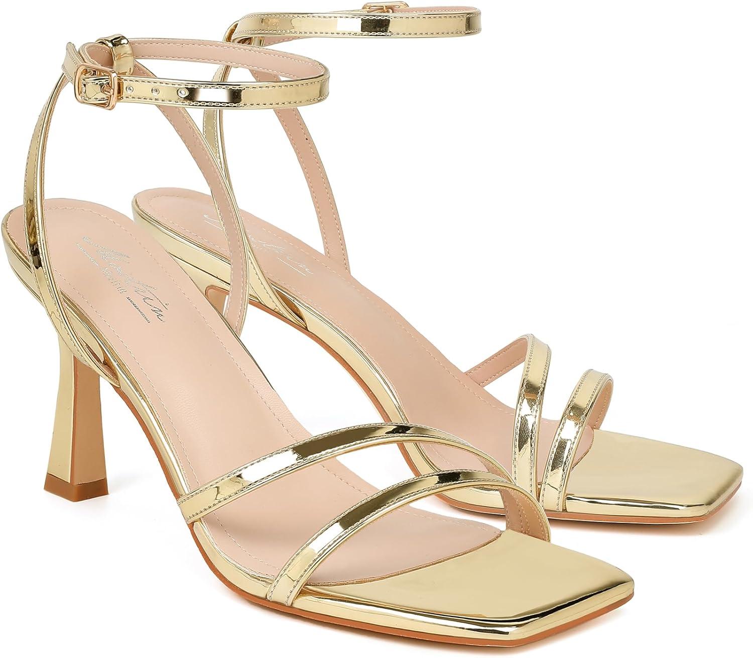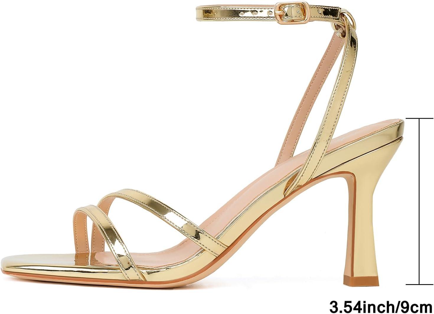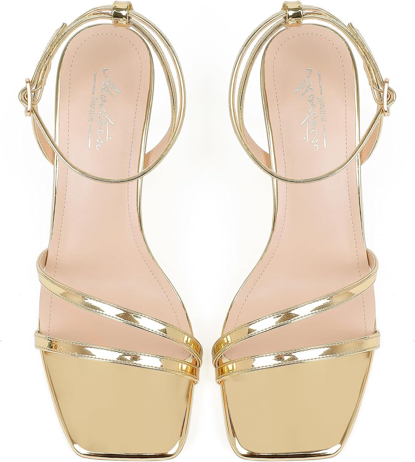 Mostrin Womens Sandals Strappy Heels for Women Ankle Strap Lace Up Square Open Toe Heels Tie Up Stiletto High Heeled Sandals for Prom, Party, Daily Wear(Gold-09)
