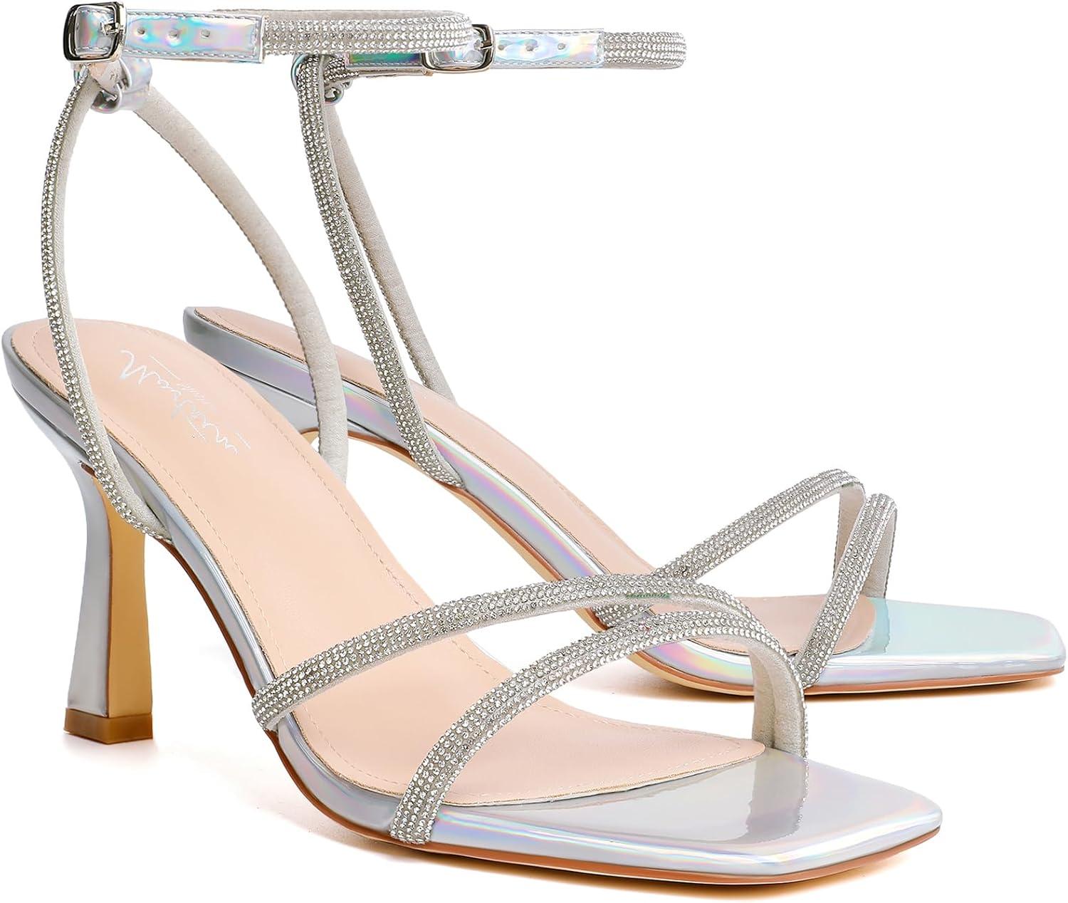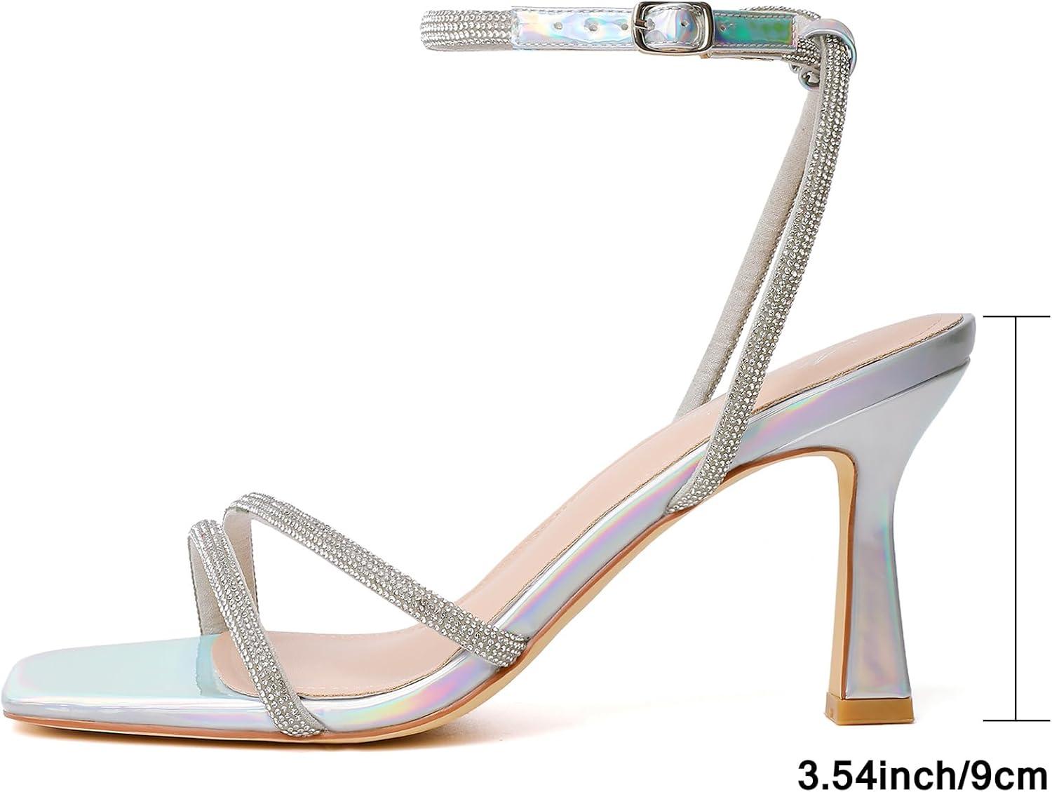 Mostrin Womens Sandals Strappy Heels for Women Ankle Strap Lace Up Square Open Toe Heels Tie Up Stiletto High Heeled Sandals for Prom, Party, Daily Wear(Lh07-sparkling Silver)