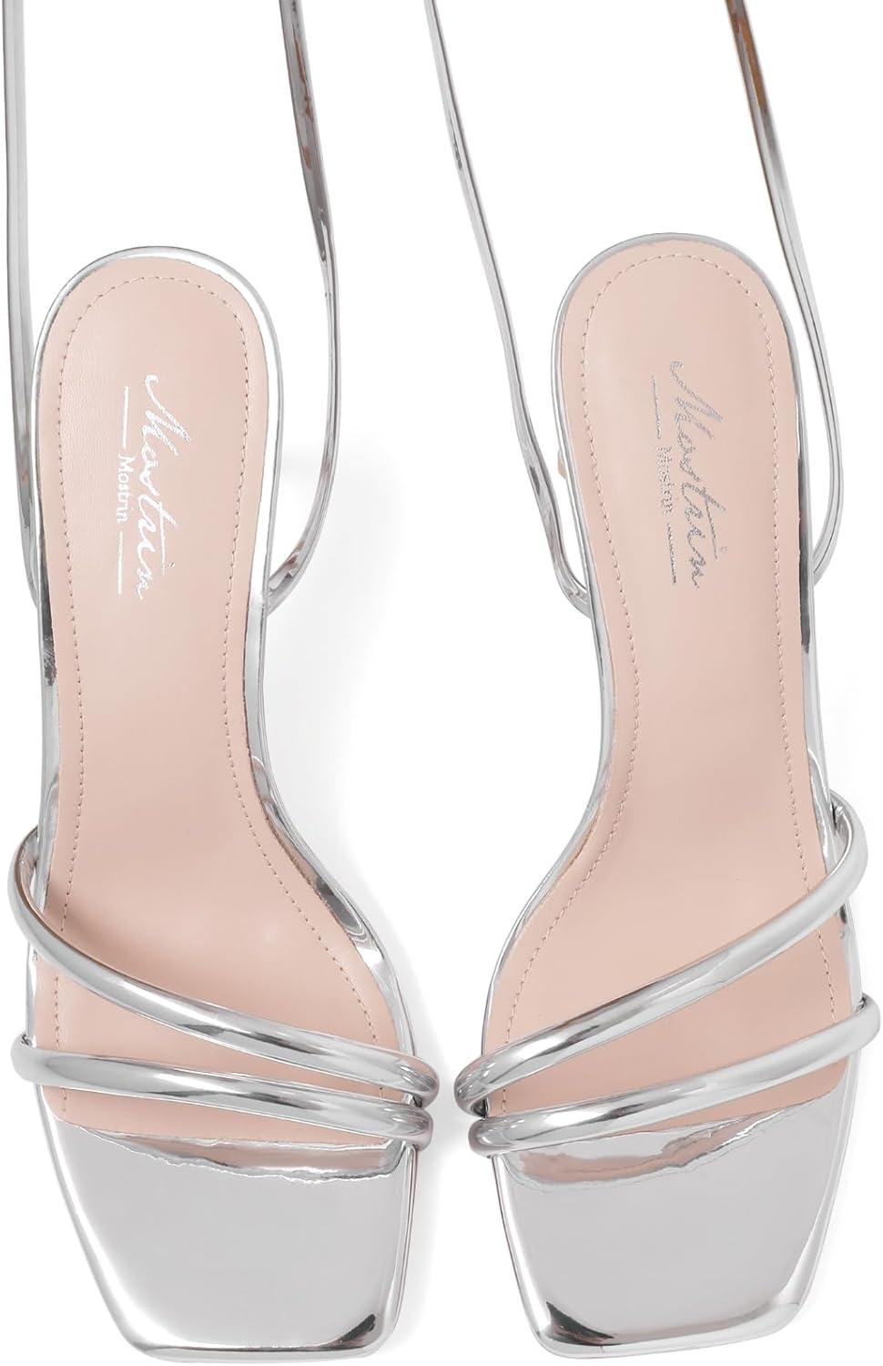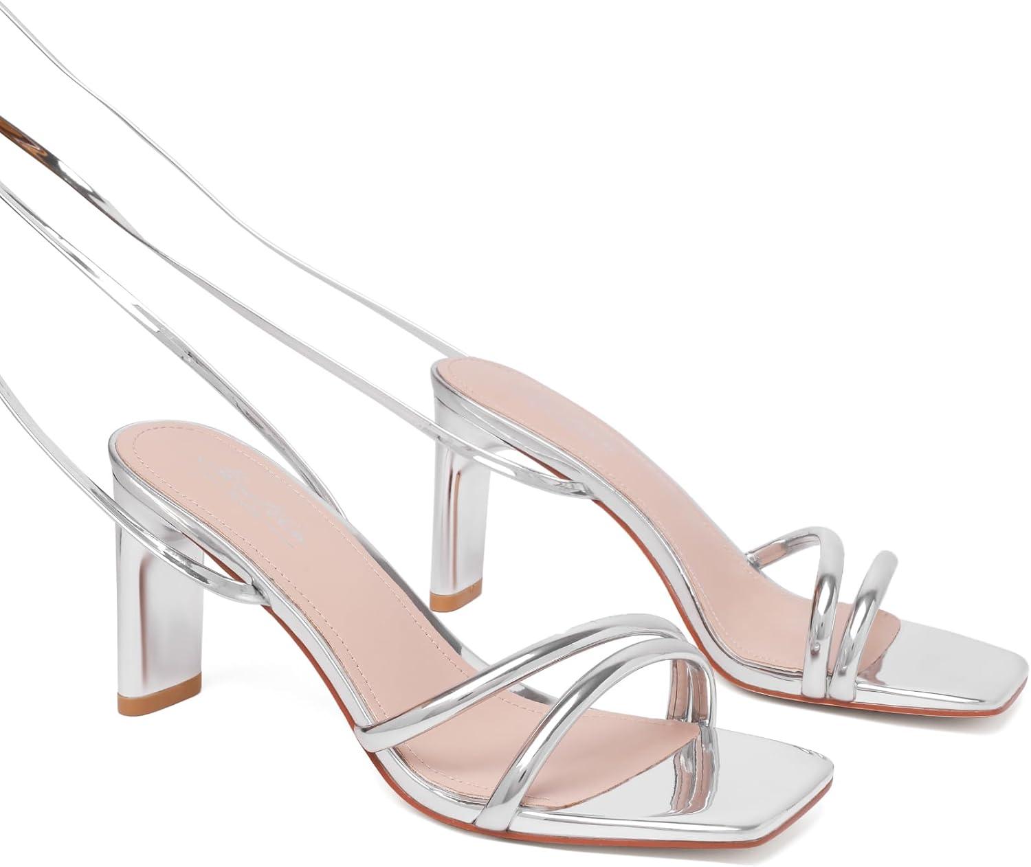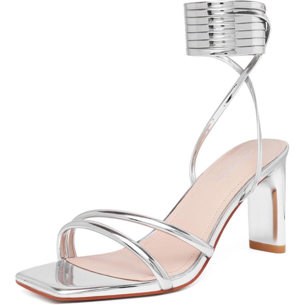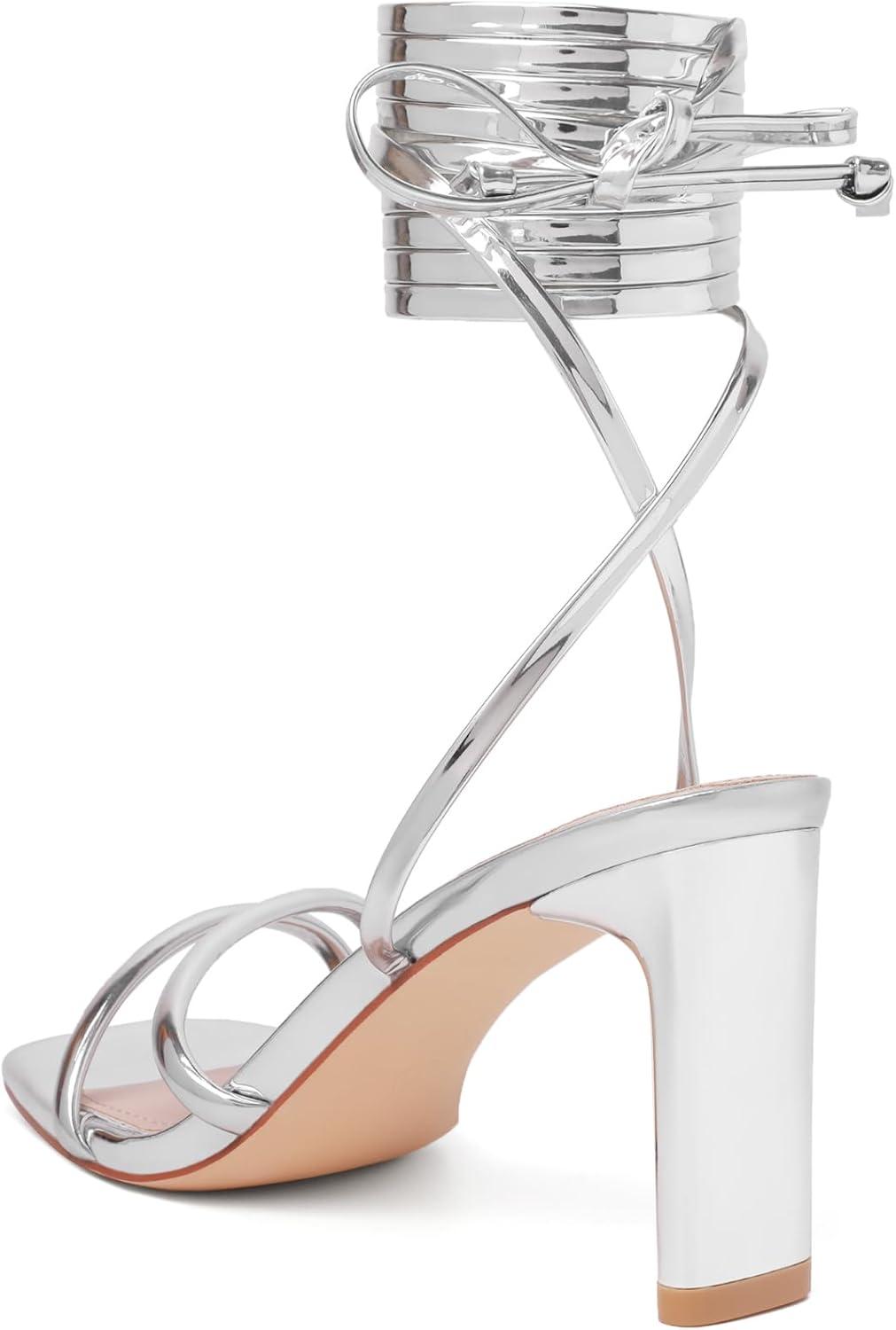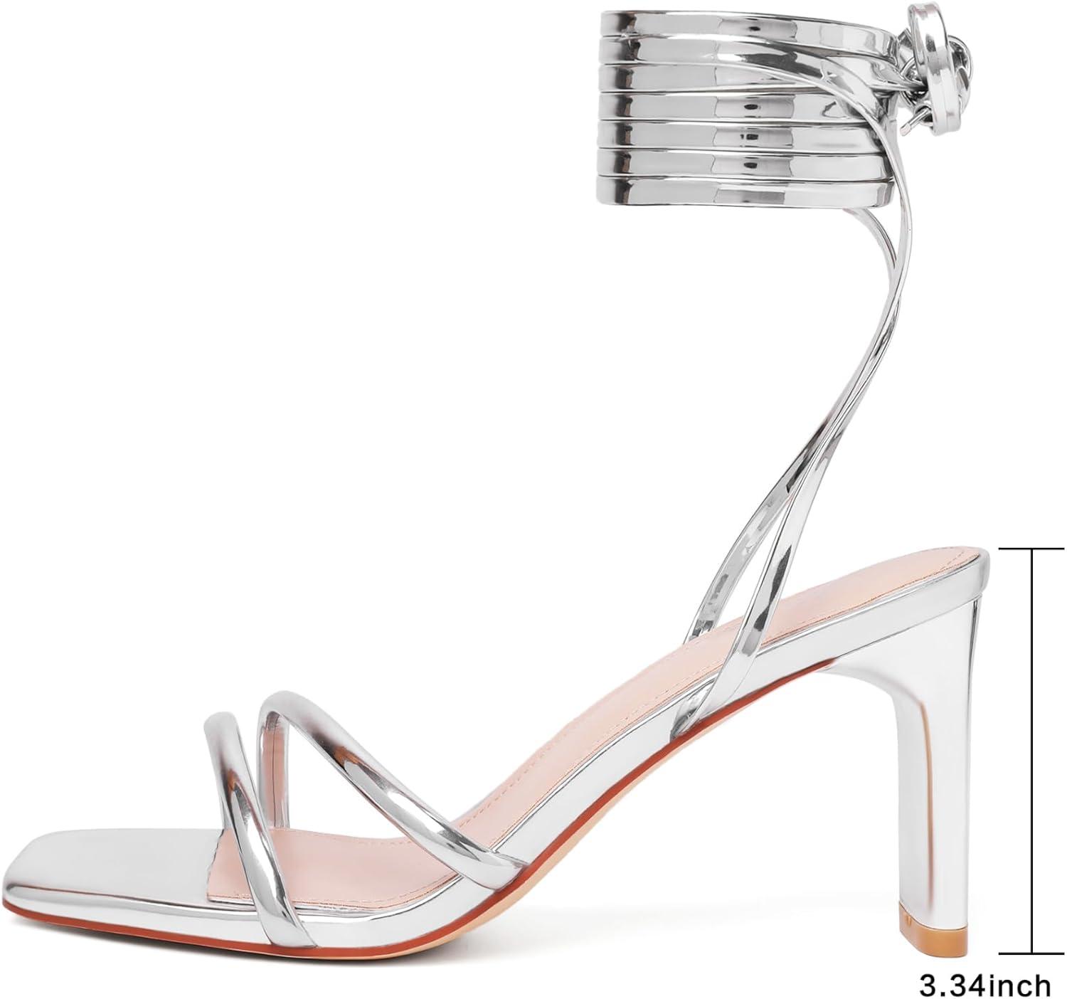 Mostrin Womens Sandals Strappy Heels for Women Ankle Strap Lace Up Square Open Toe Heels Tie Up Stiletto High Heeled Sandals for Prom, Party, Daily Wear(Silver-02)